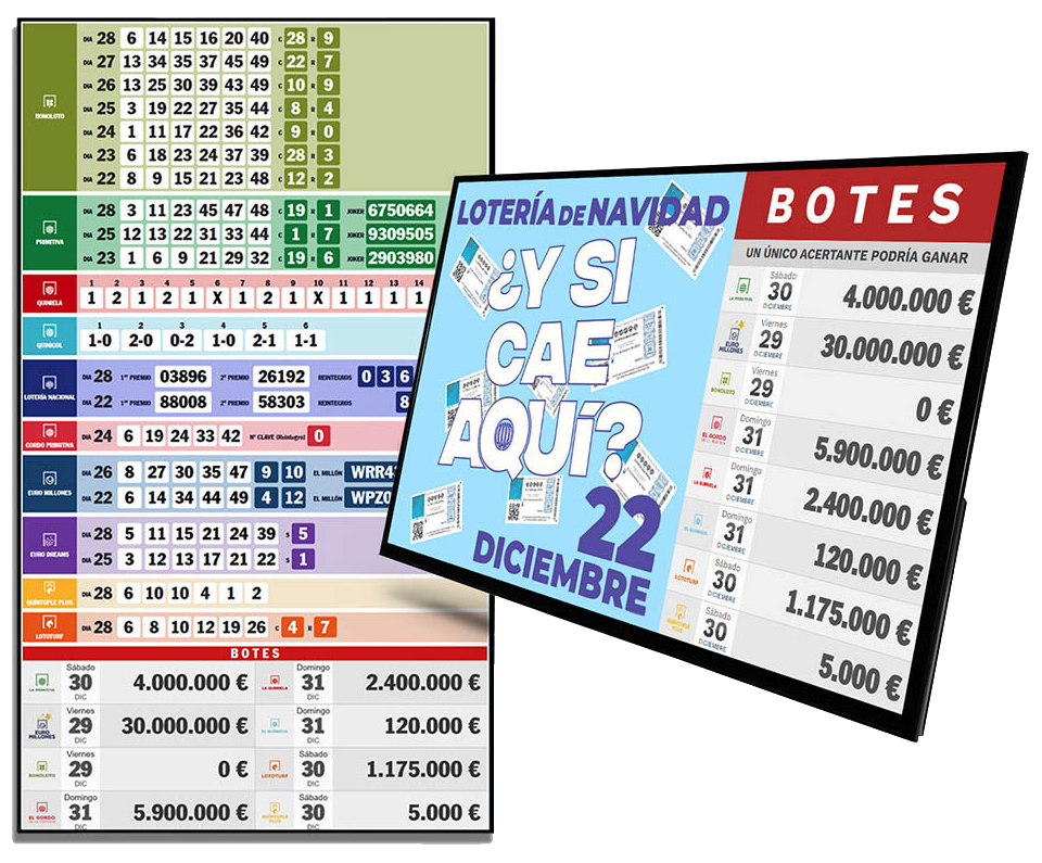 La pantalla vertical, dos formatos, muestra los botes en carrusel y se pueden alternar con imágenes de productos o avisos generados por el propio punto de venta.